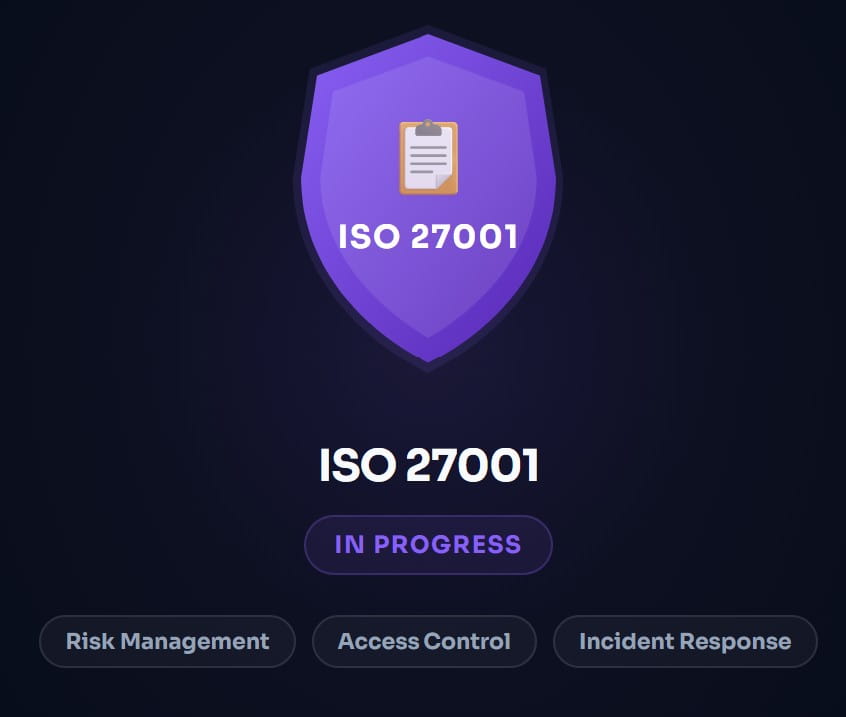 Information security management system certification in progress. Expected completion Q3 2026.
